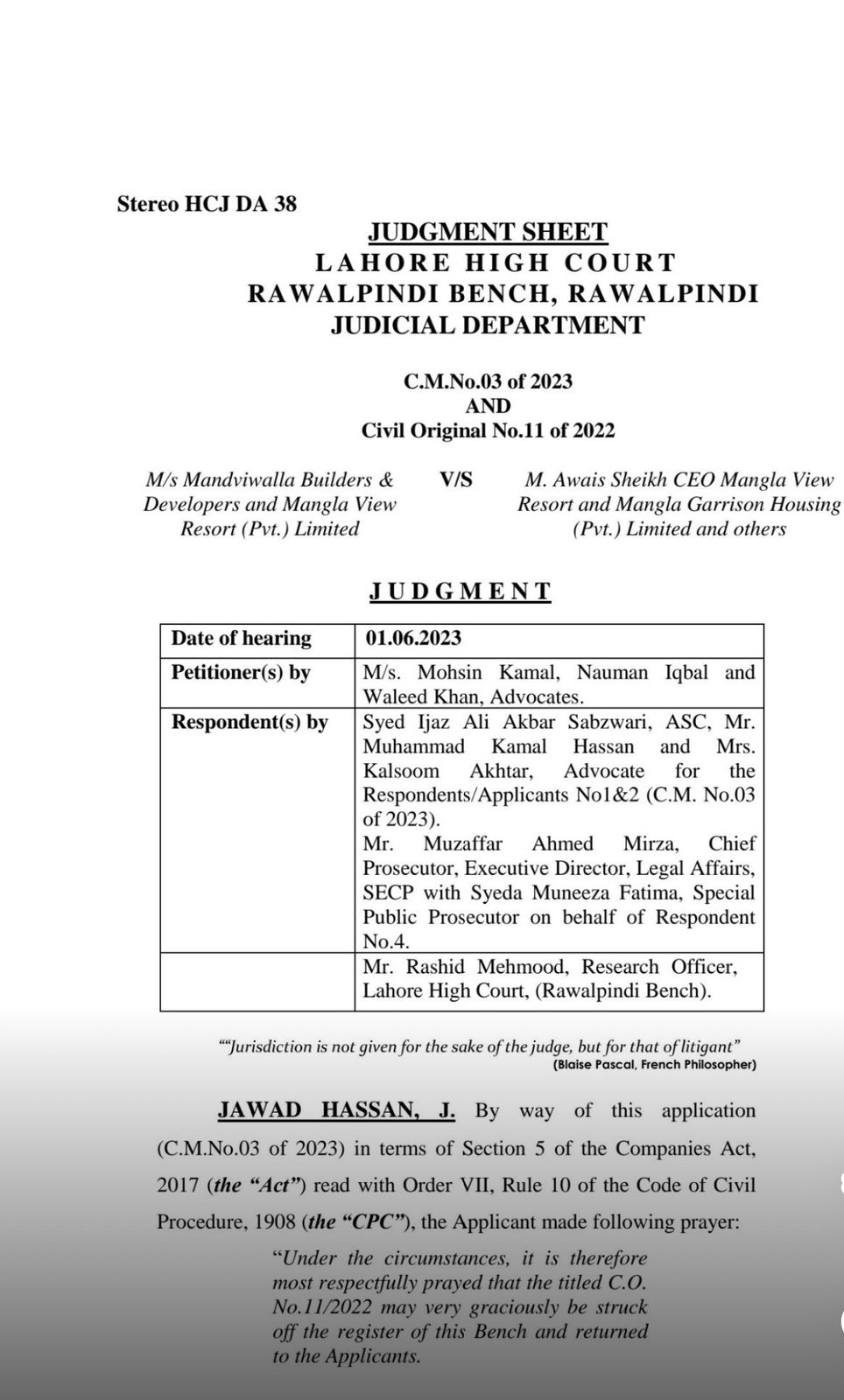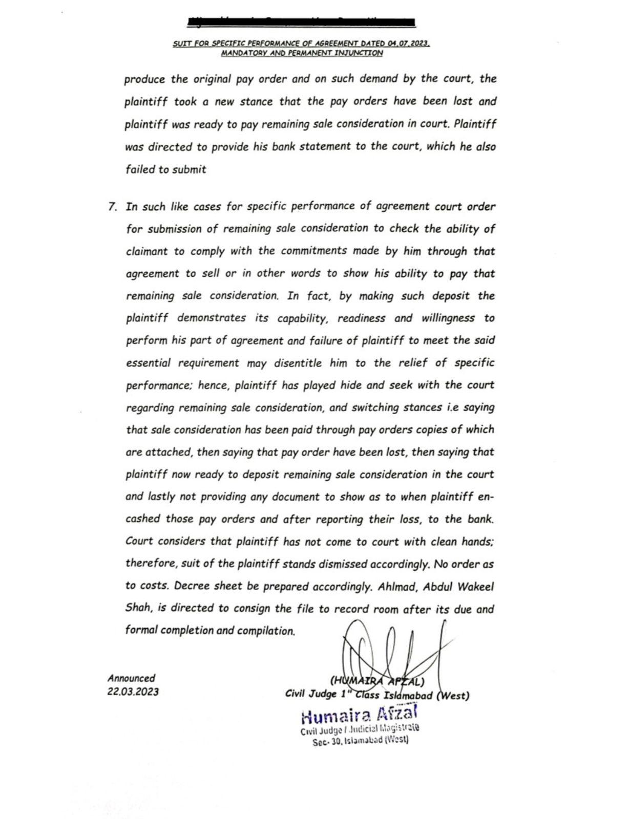 Advocate Waleed Ahmad successfully represented the Defendant in a specific performance suit, achieving dismissal of the Plaintiff's claim.